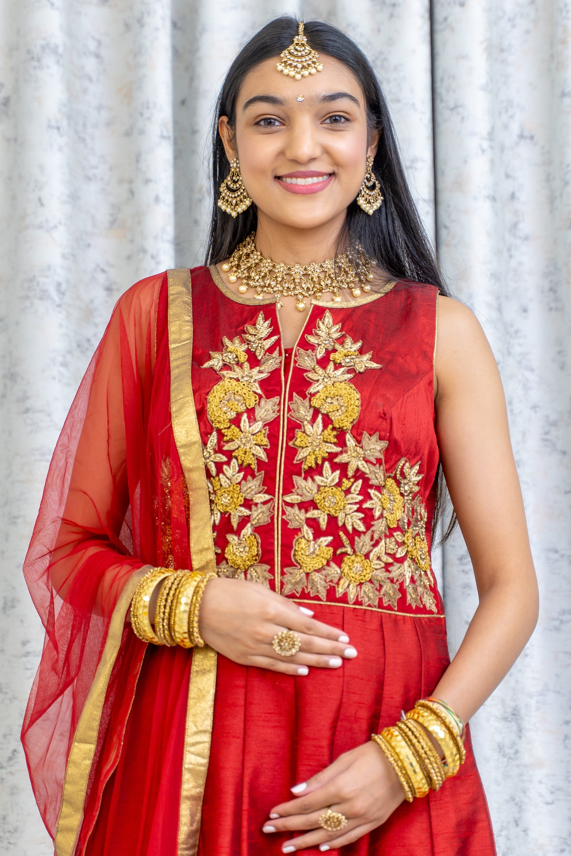 Deep Red Chinon Silk Punjabi Set with Swarovski Stone Work