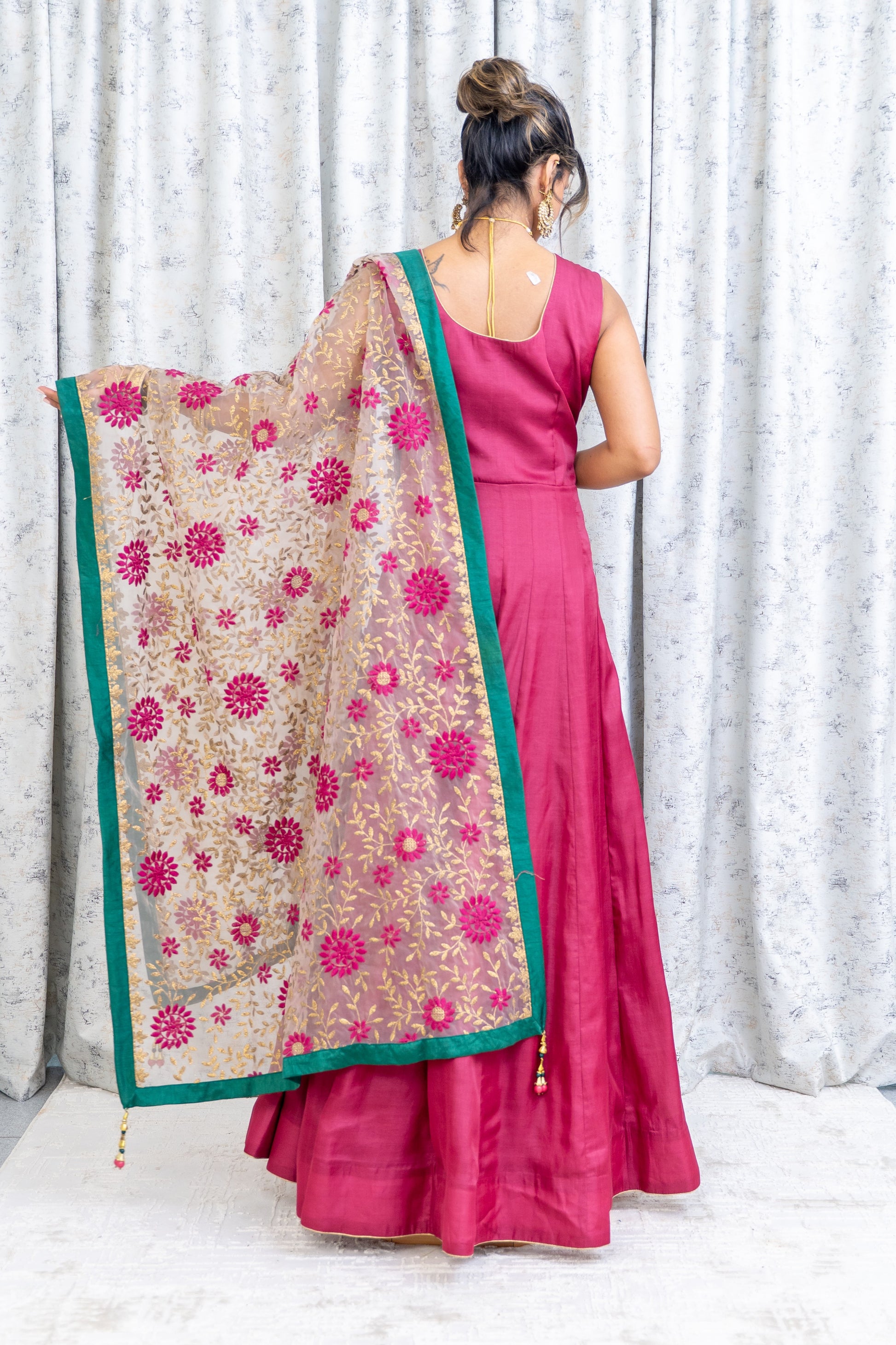 Dusty Rose Coloured Chinon Silk Punjabi Set with Contrast Dupatta