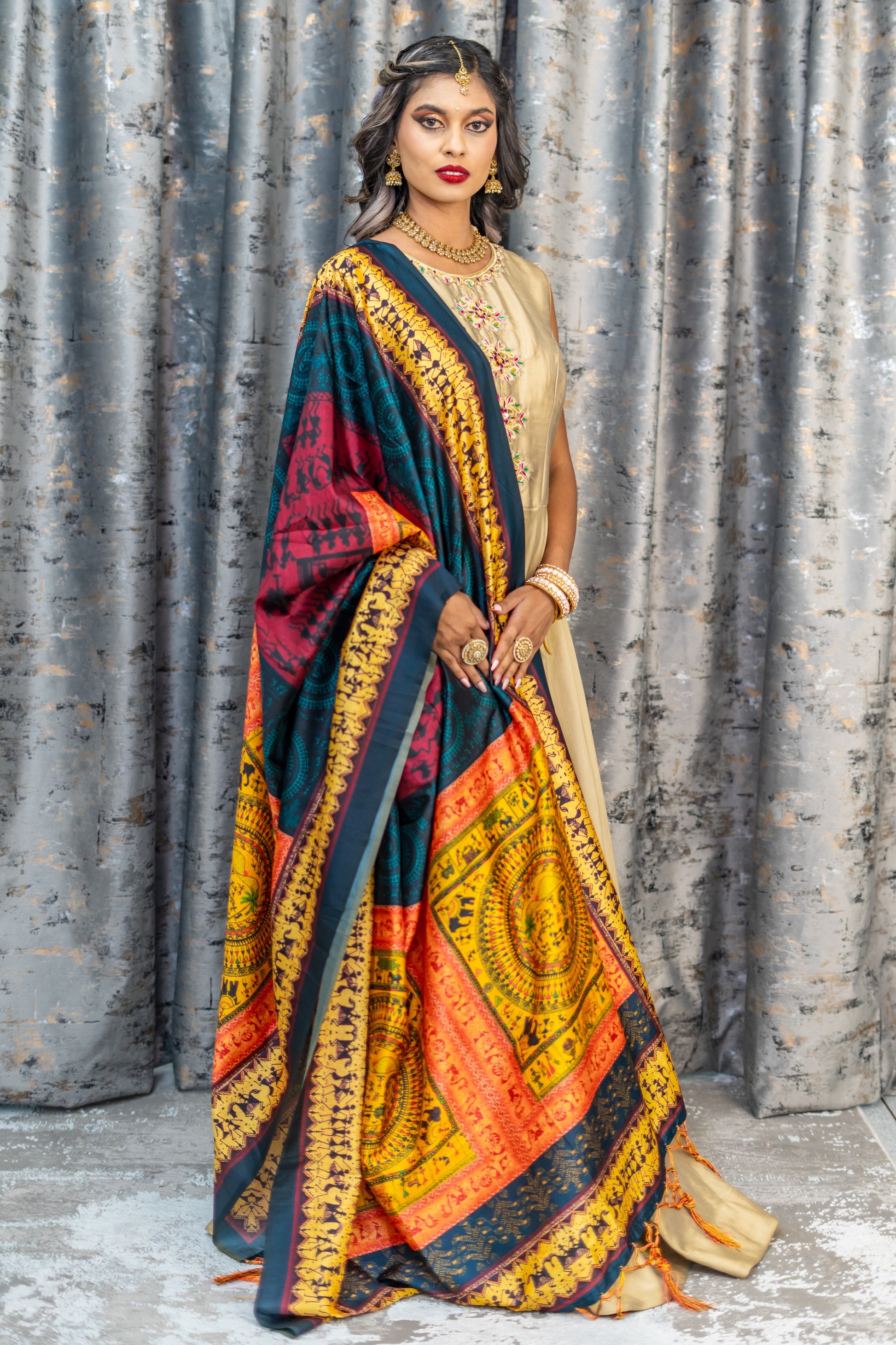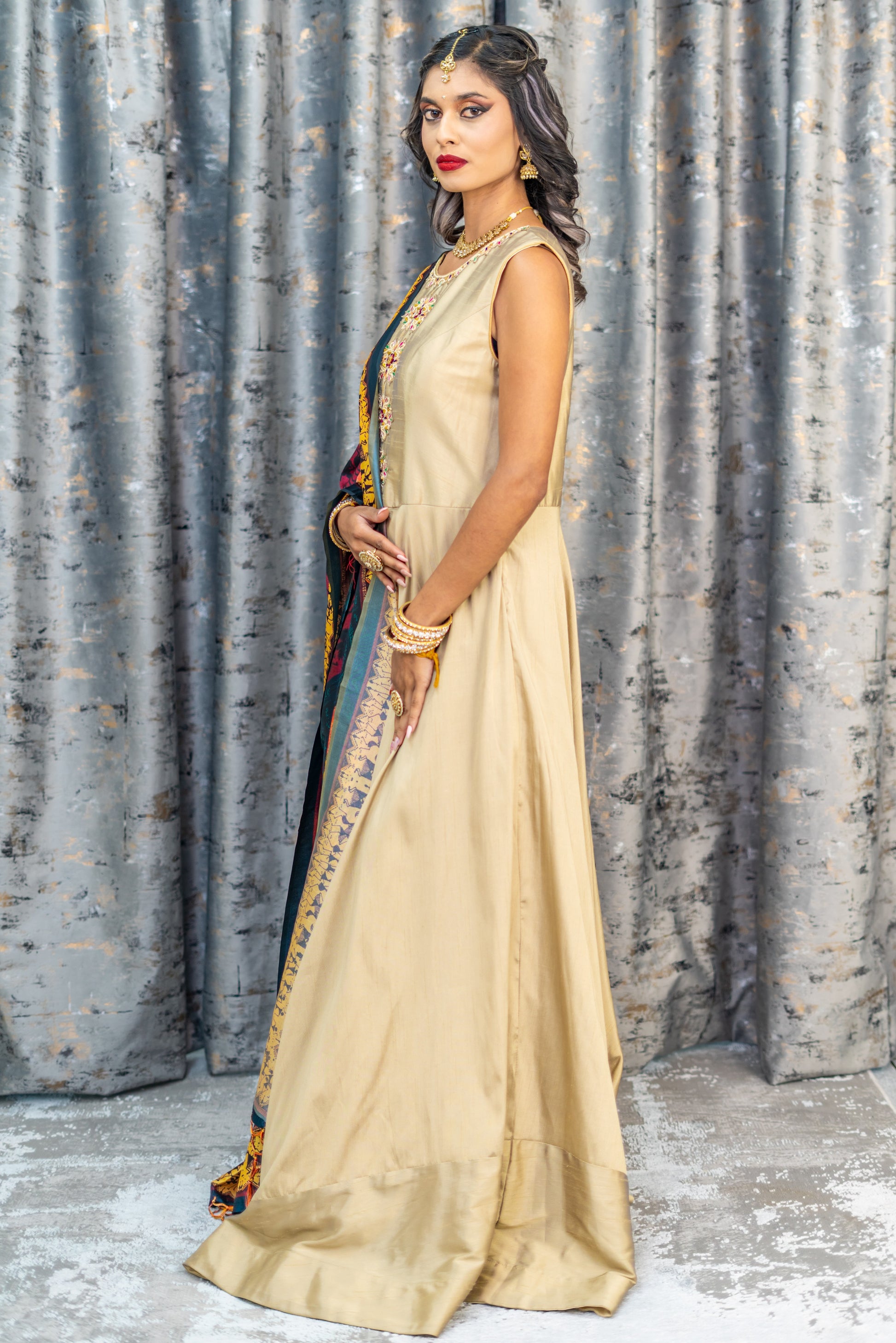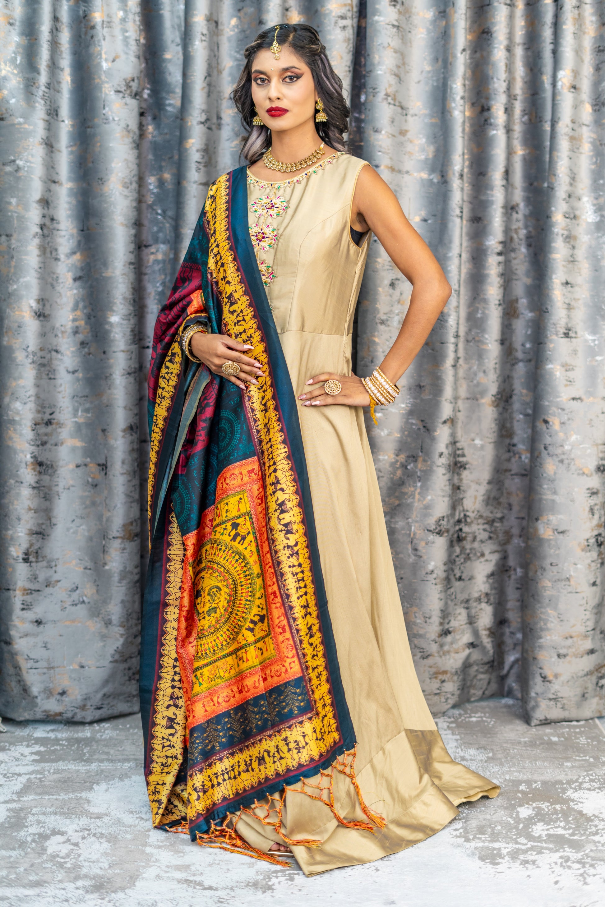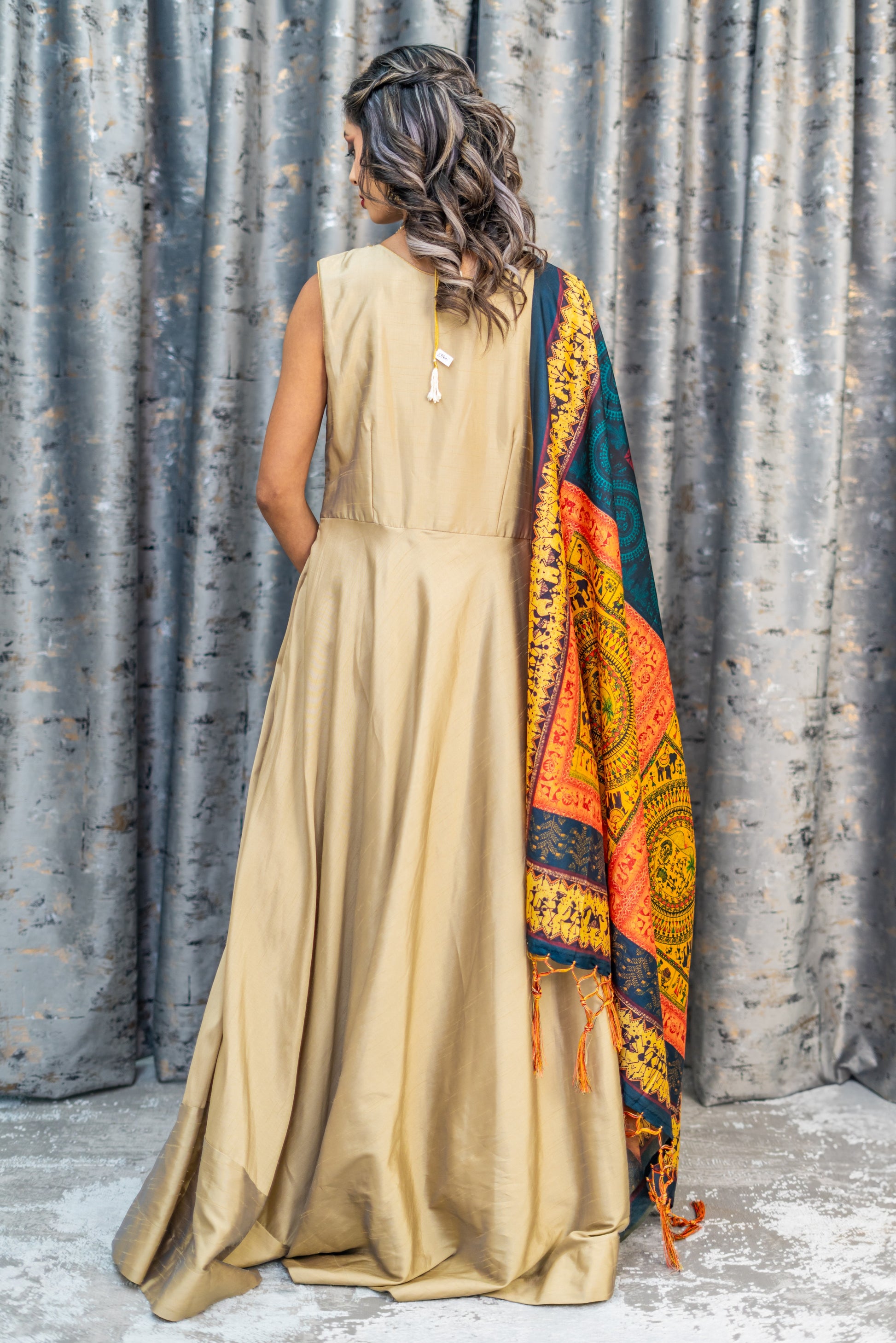 Gold Raw Silk Anarkali Set With Printed Scarf