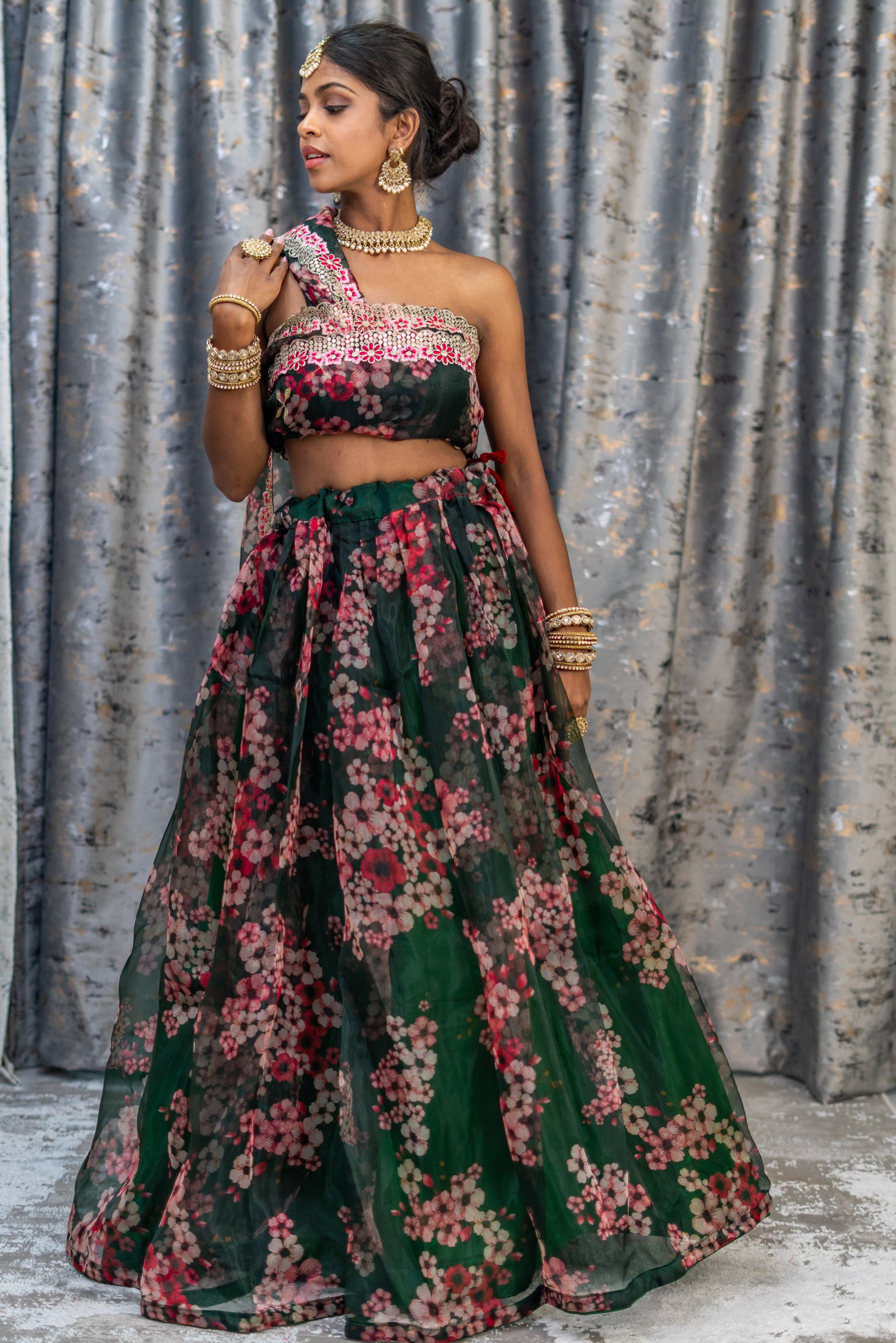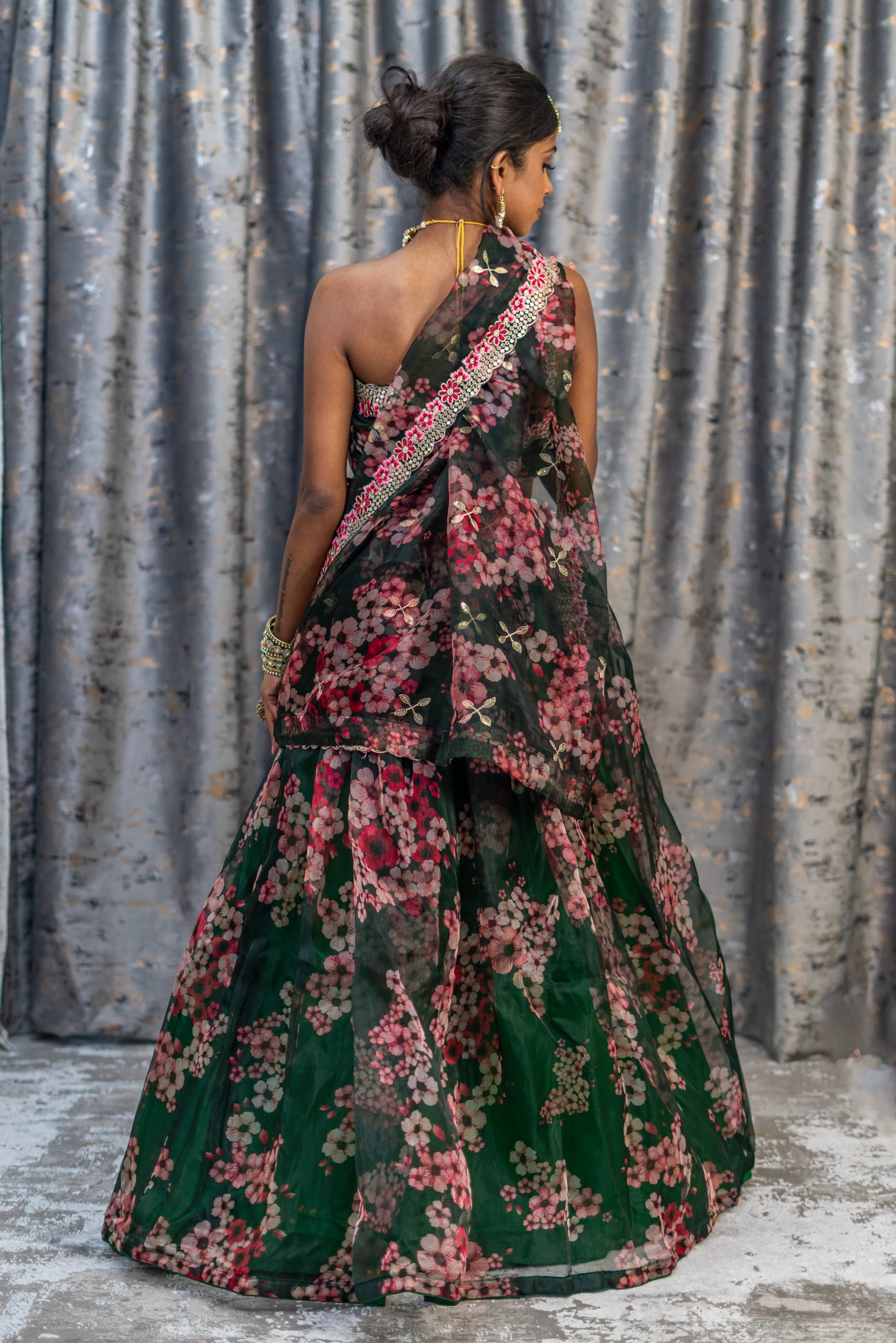 Unstitched Green Floral Organza Unstitched Lehenga Set