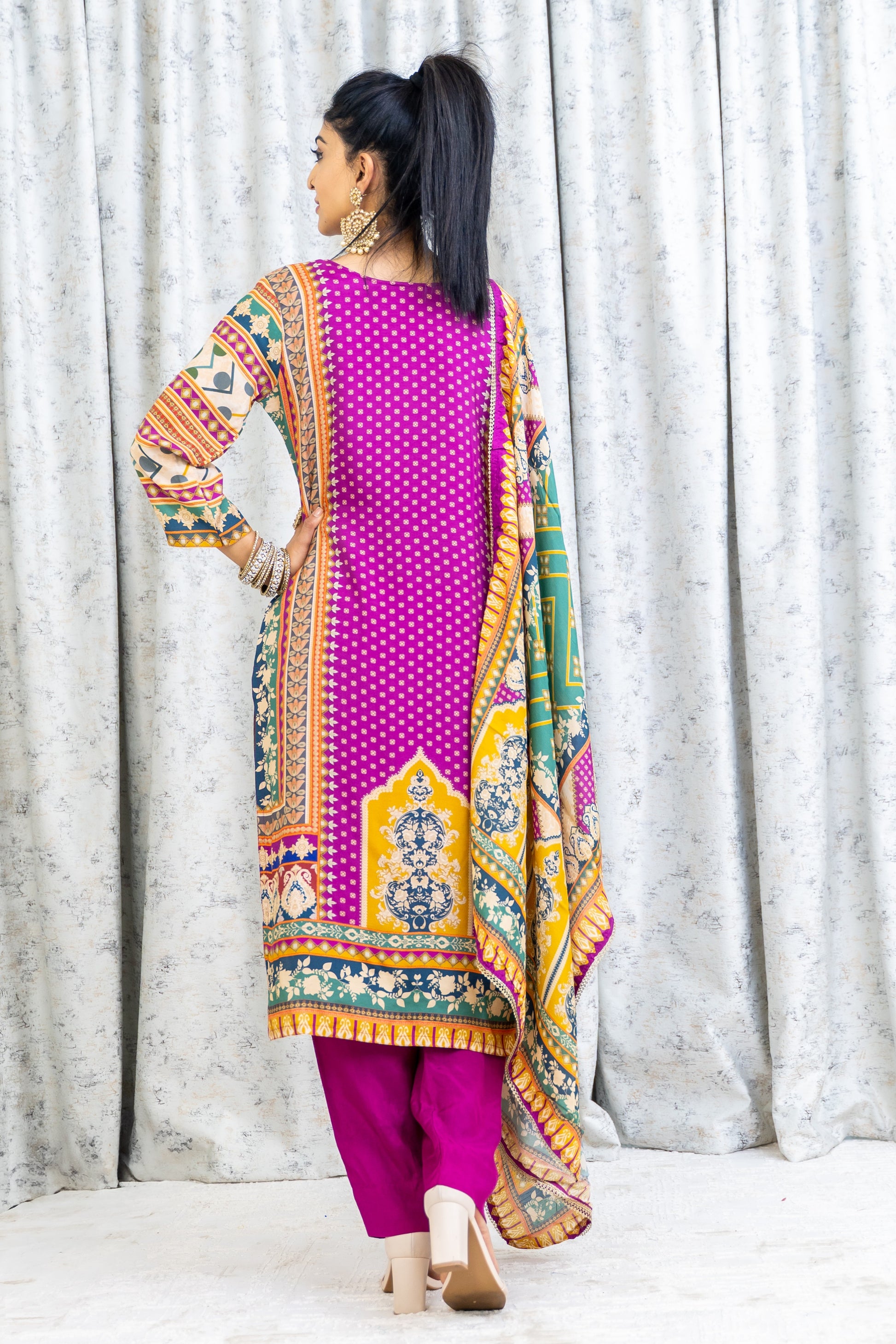Purple Colourful Chinon Silk Punjabi Set
