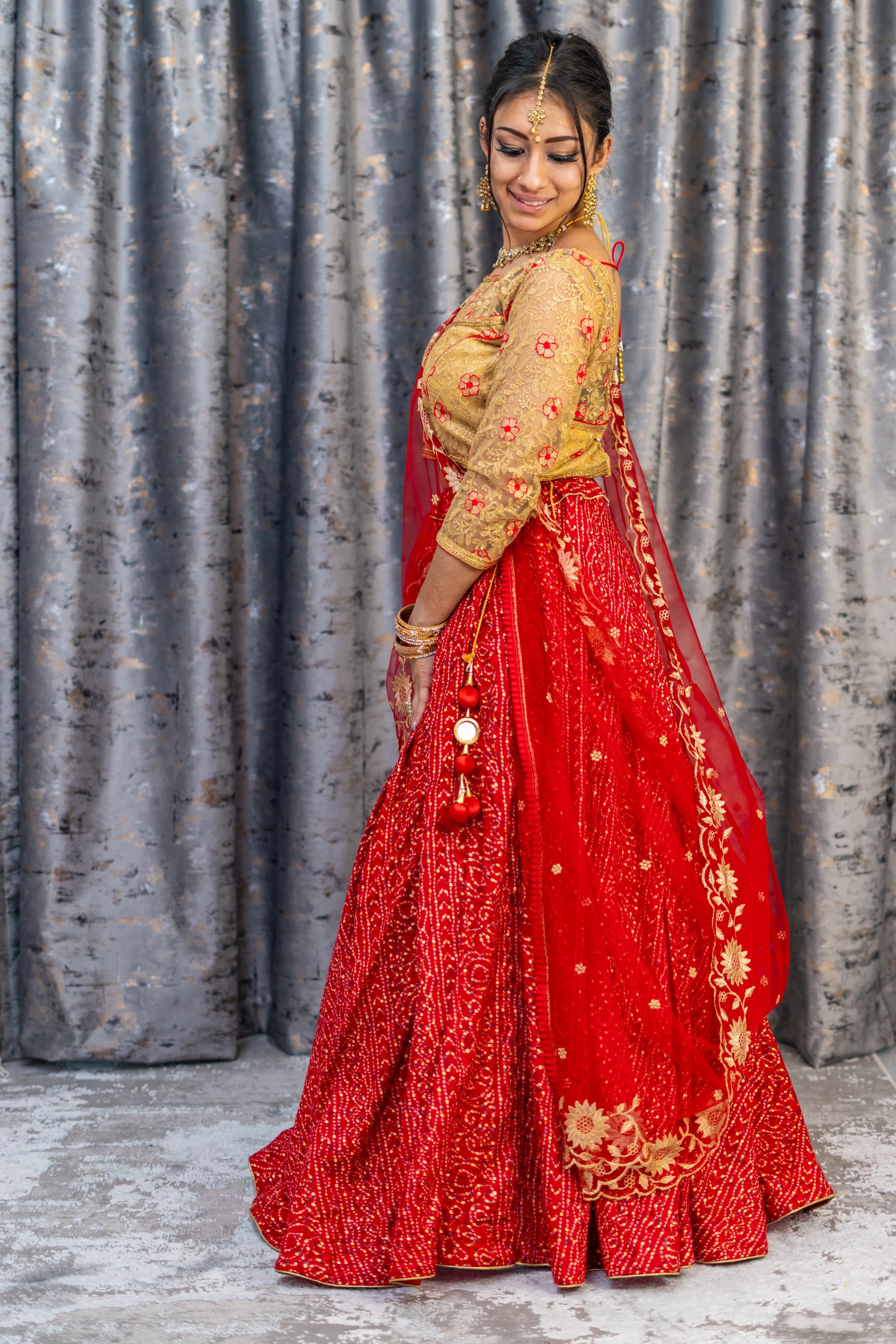Red Chiffon Bandhani Print Lehenga Set